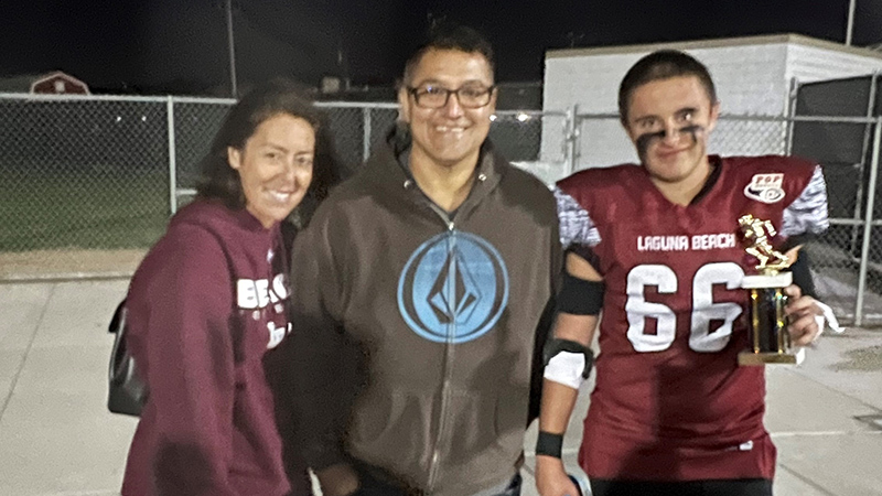 Alfonso “Manny” Perez (center), smiling happily alongside his wife and son after his son’s football match.