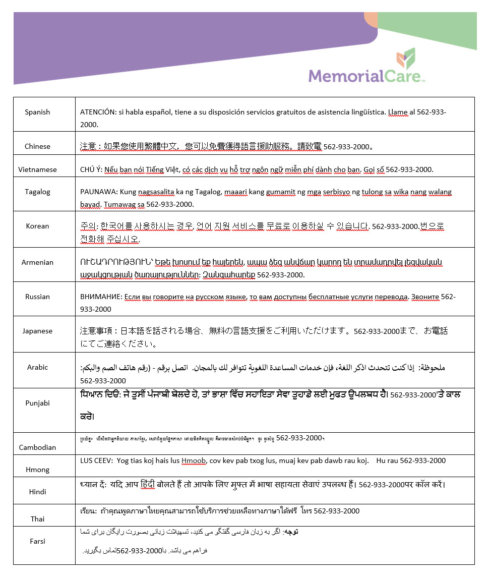 MemorialCare cumple con las leyes federales de derechos civiles aplicables y no discrimina por motivos de raza, color, nacionalidad, edad, discapacidad o sexo.